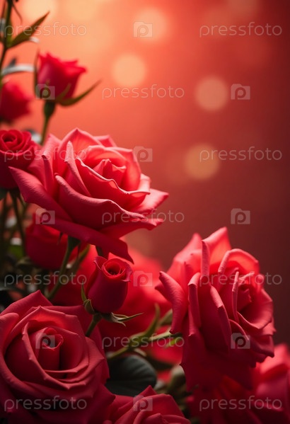 Пышные красные розы цветут страстно, бархатистые лепестки ловят нежный блеск боке огней. Очаровательная композиция завораживающая атмосфера любовь восхищение. Пустое место приглашает сердечные сообщения AI