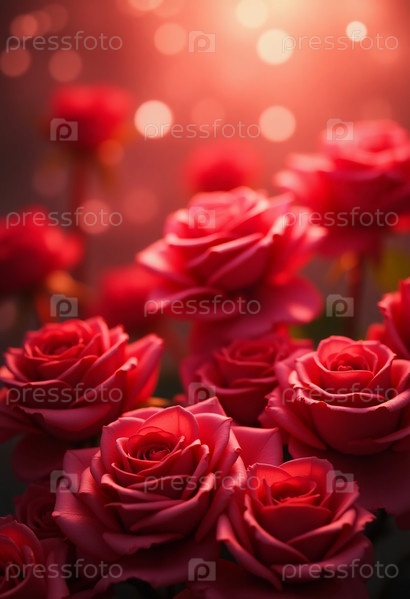 Пышные красные розы цветут страстно, бархатистые лепестки ловят нежный блеск боке огней. Очаровательная композиция завораживающая атмосфера любовь восхищение. Пустое место приглашает сердечные сообщения AI
