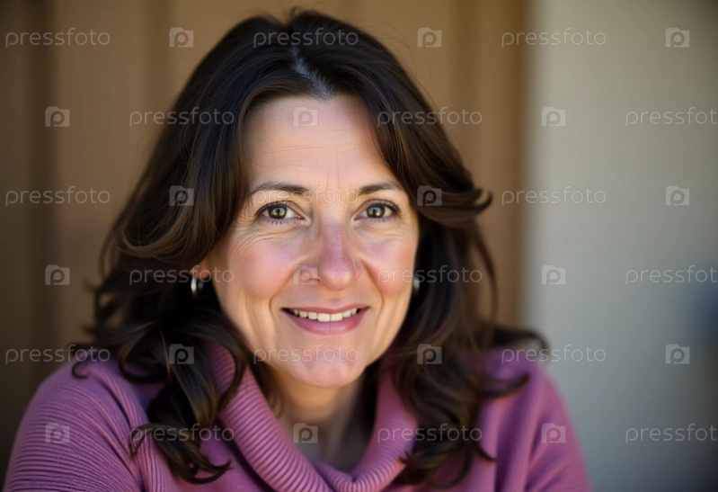 Женщина средних лет грациозно сидит на деревянной скамейке, демонстрируя теплую и привлекательную улыбку. Солнечный свет проникает сквозь листья, создавая безмятежную атмосферу сада Генеративный ИИ