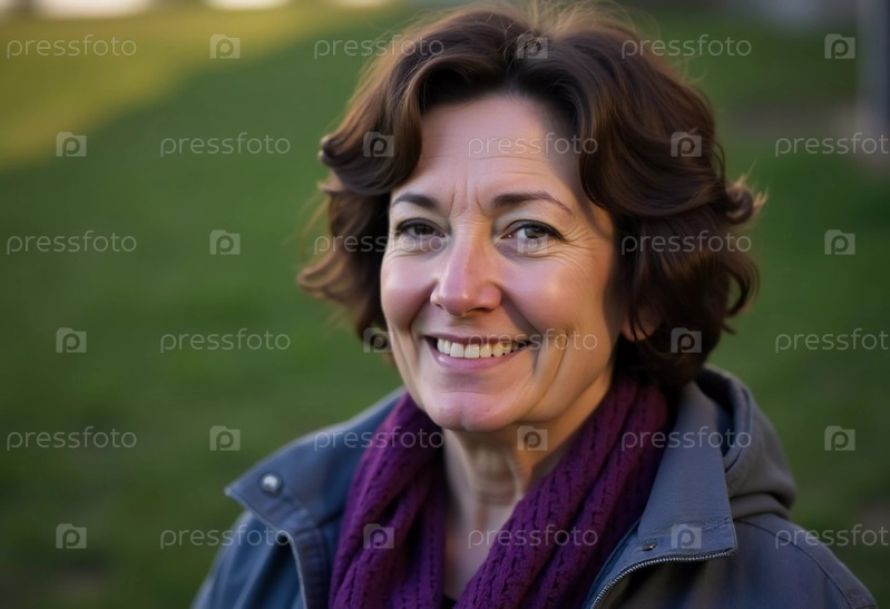 Среди пышной зелени женщина средних лет с вьющимися волосами излучает тепло своей веселой улыбкой, закутавшись в уютный шарф, наслаждаясь умиротворяющей атмосферой парка Генеративный ИИ