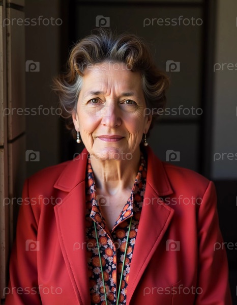 В уютном интерьере уверенно улыбается женщина средних лет, одетая в яркий блейзер поверх цветочной блузки, излучающая очарование и изысканность, приглашающая к общению. Генеративный искусственный интеллект