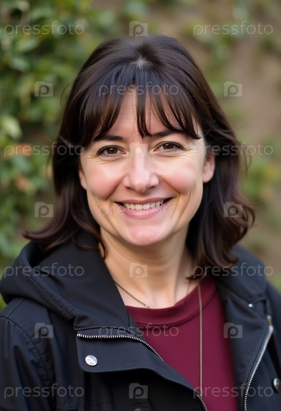 Женщина средних лет с темными волосами до плеч и дружелюбной улыбкой стоит среди зелени, излучая тепло и доступность при дневном свете. Генеративный ИИ