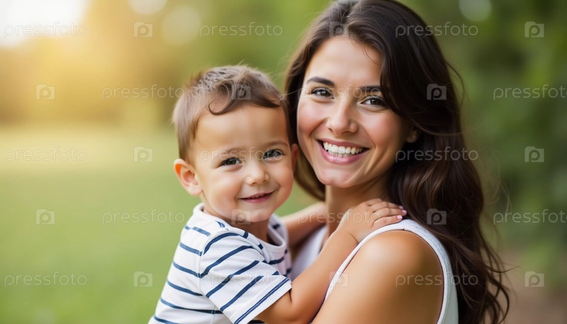 Мать прижимает к себе своего веселого малыша, оба светятся от счастья, наслаждаясь солнечным днем в ярком парке, полном зелени. Генеративный искусственный интеллект