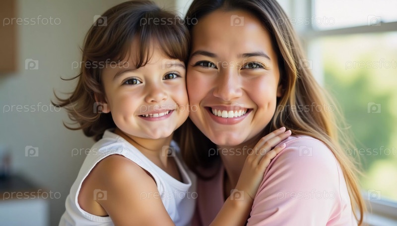 Мать и ее маленький ребенок разделяют момент нежности, излучая счастье, обнимая друг друга в ярком, гостеприимном доме, наполненном теплом и любовью. Генеративный искусственный интеллект
