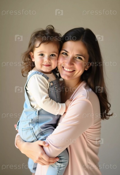 Любящая мать держит своего веселого ребенка близко, обе сияют улыбками, которые освещают безмятежную комнату. Их связь отражает тепло, радость и единение в этот драгоценный момент