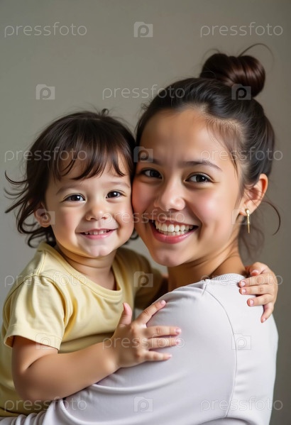 Радостный обмен чувствами происходит, когда любящая мать обнимает своего счастливого ребенка, и обе сияют улыбками в уютной обстановке помещения, излучая счастье и единение