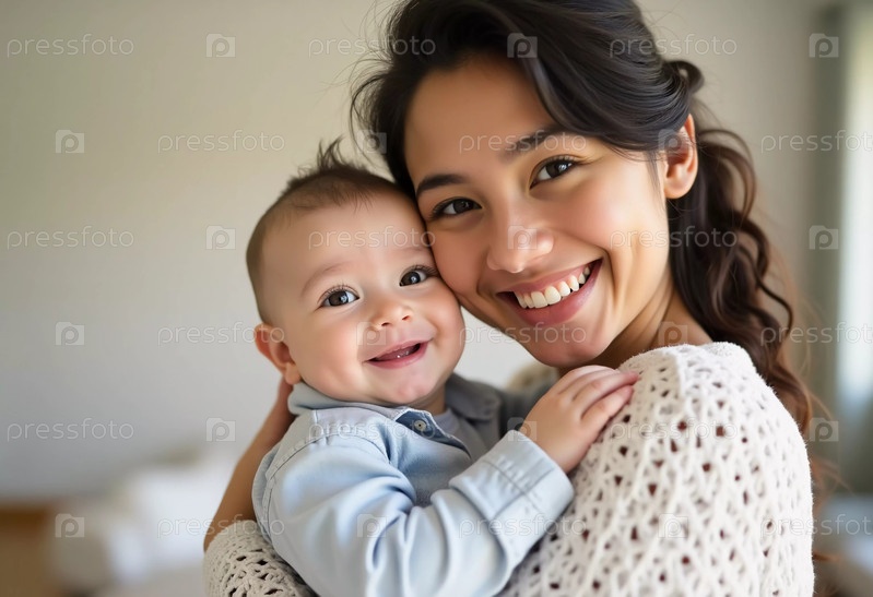 Любящая мать держит своего улыбающегося ребенка в теплых объятиях, разделяя интимный момент. Их улыбки излучают радость, подчеркивая связь, наполненную любовью и счастьем