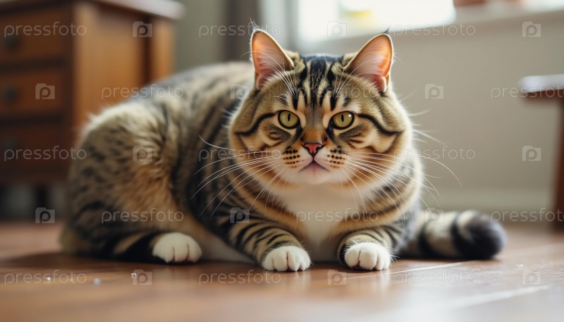 Толстый кот отдыхает на полированном деревянном полу, его глаза сверкают озорством и любопытством, улавливая тепло солнца, льющегося через окно