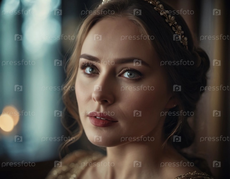 Поразительная русская красавица смотрит проникновенными глазами, облаченная в потрясающее платье и сверкающие аксессуары, идеально освещенная мягким, теплым светом. Генеративный искусственный интеллект
