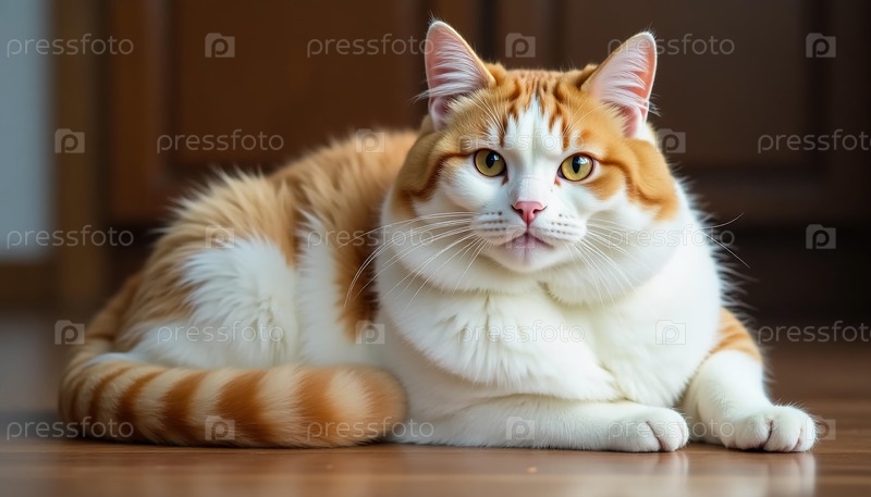В уютной комнате, наполненной естественным светом, пушистый рыжий кот красиво отдыхает на гладком деревянном полу, излучая чувство удовлетворения и пухлого очарования во время отдыха