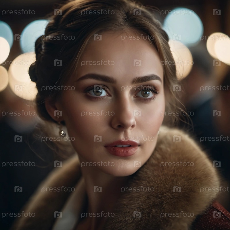 Среди собрания, наполненного теплом и мягким светом, задумчиво смотрит потрясающая русская красавица, украшенная роскошным меховым воротником, который добавляет изящества ее облику. Генеративный искусственный интеллект