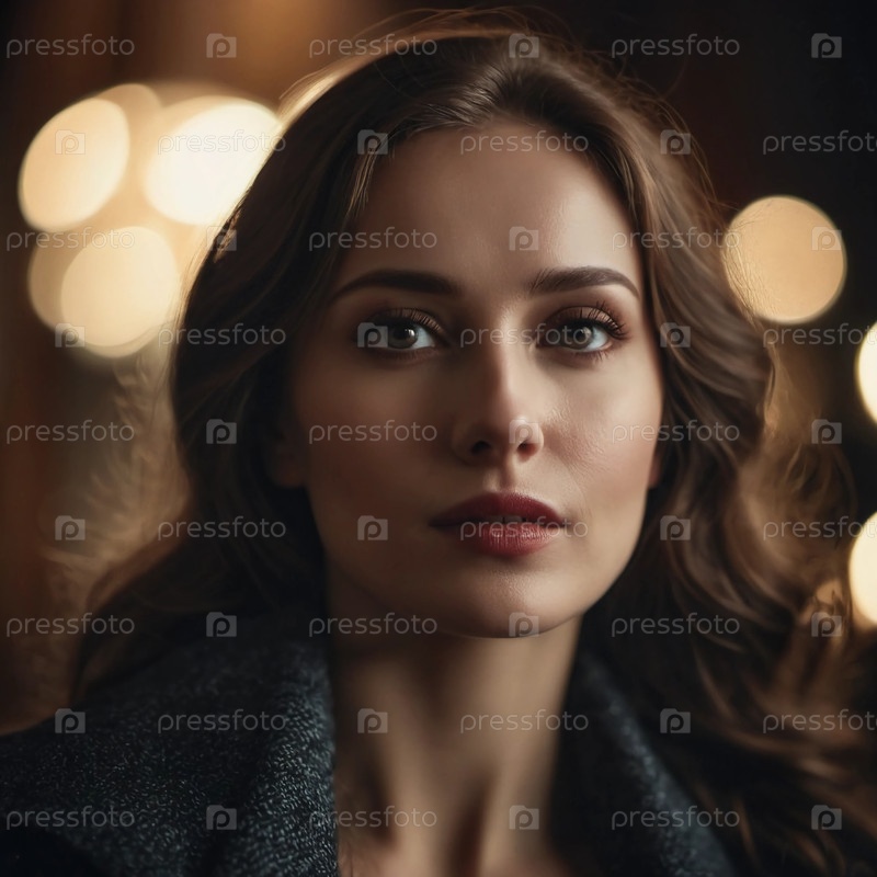 В уютном, мягко освещенном помещении потрясающая русская красавица пристально и с безмятежной уверенностью смотрит на окружающих, демонстрируя свои изящные черты на размытом фоне, который усиливает ее очарование