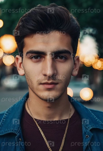 На оживленной улице в сумерках молодой армянин демонстрирует свою харизму и решимость. Его взгляд отражает страсть к жизни, окруженный яркими городскими огнями Генеративный ИИ