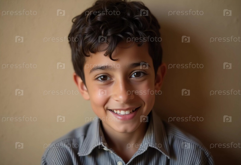Молодой йеменский мальчик с вьющимися волосами сияет яркой улыбкой, демонстрируя свой игривый дух. Его полосатая рубашка контрастирует с теплыми, землистыми тонами стены позади него Генеративный ИИ