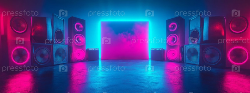 Ночной неоновый танцпол с динамиками и яркими огнями