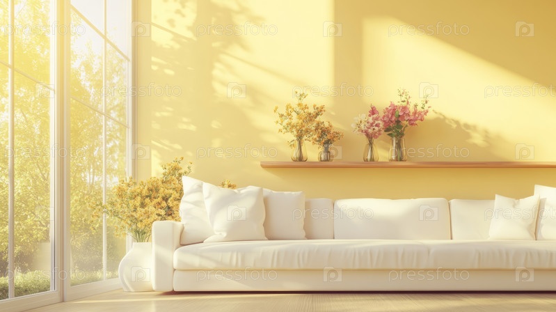 Русский: Солнечный свет заливает уютное жилое пространство, подчеркивая белый диван и яркие желтые стены, создавая теплую уютную атмосферу с естественной зеленью
