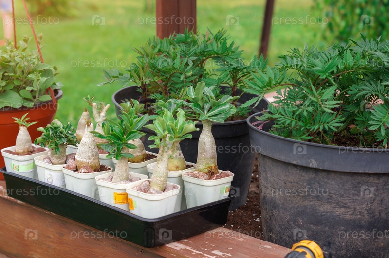 Сеянцы экзотических растений с названием Адениум (роза пустыни) дышат свежем летним воздухом вместе с рябинниками и петуньей
