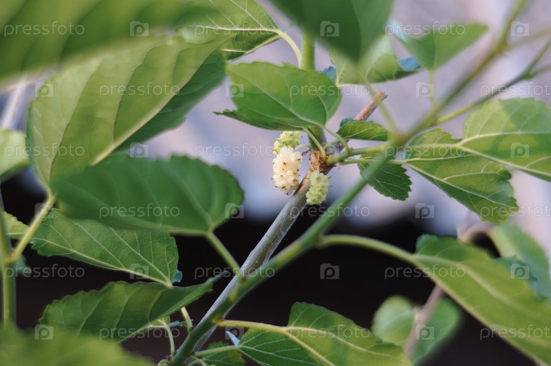 Плоды белого тутовника на ветке (Шелковица белая Morus alba)