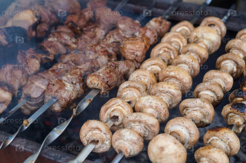 Шашлык из мяса и грибов на шампурах с дымком