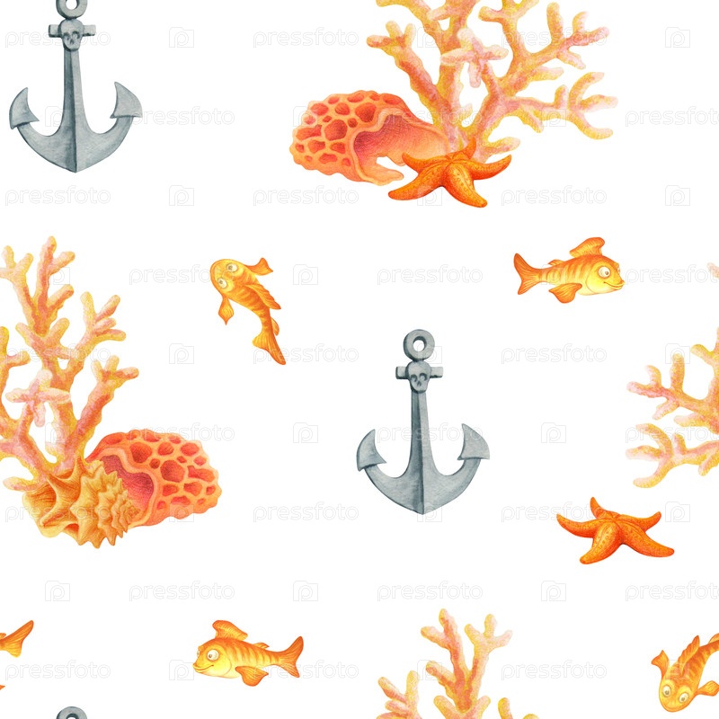 Акварельный бесшовный узор с рыбками, якорями, ракушками, морскими звездами и кораллами на белом фоне. Подводный мир. Жизнь в океане. Простой дизайн для летней ткани или обоев в морском стиле. Watercolor seamless pattern with underwater world, fish, ancho