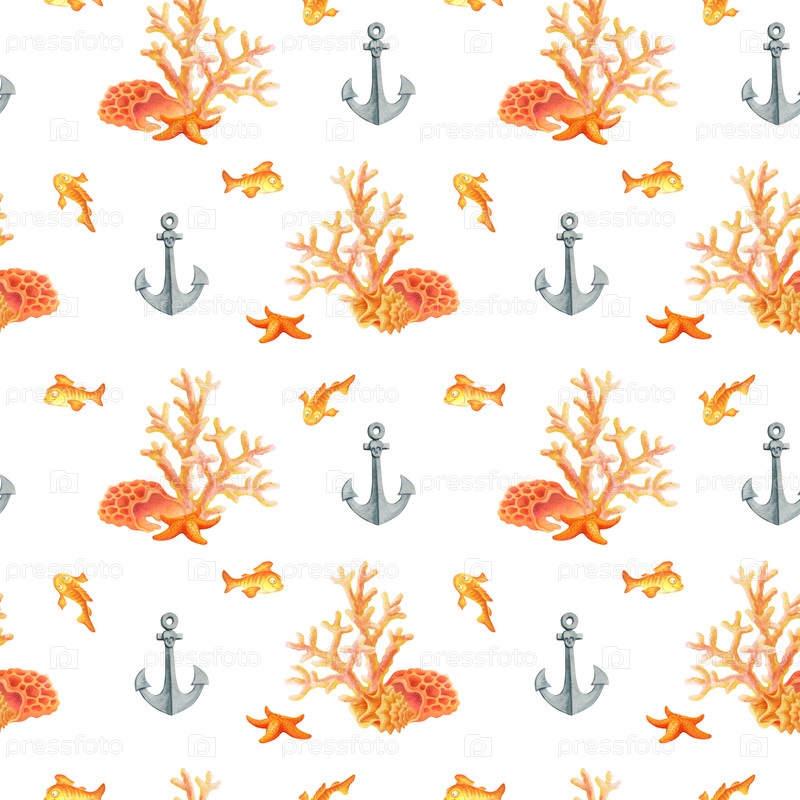 Акварельный бесшовный узор с рыбками, якорями, ракушками, морскими звездами и кораллами на белом фоне. Подводный мир. Жизнь в океане. Простой дизайн для летней ткани или обоев в морском стиле. Watercolor seamless pattern with underwater world, fish, ancho