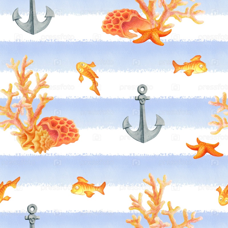 Подводный мир. Акварельный бесшовный узор с рыбами, якорями, ракушками, морскими звездами и кораллами на сине-белом полосатом фоне. Простой дизайн для летней ткани или обоев в морском стиле. Underwater world. Watercolor seamless pattern with fish, anchors