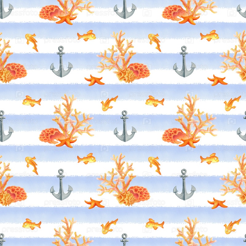 Подводный мир. Акварельный бесшовный узор с рыбами, якорями, ракушками, морскими звездами и кораллами на сине-белом полосатом фоне. Простой дизайн для летней ткани или обоев в морском стиле. Underwater world. Watercolor seamless pattern with fish, anchors