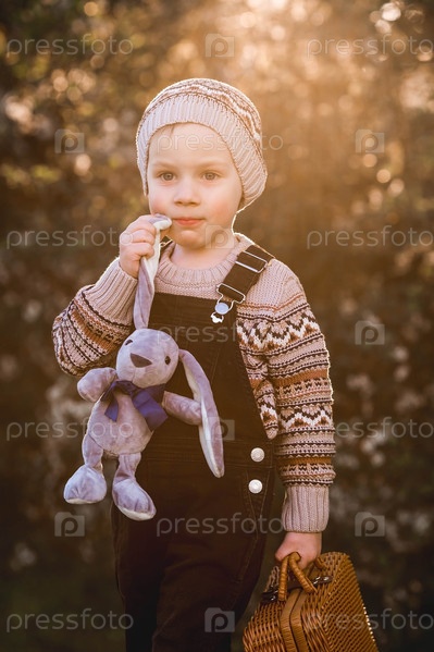 Детство. Маленький мальчик на улице с чемоданом и плюшевым кроликом отправляется в путешествие. Красивый портрет ребенка, играющего на улице