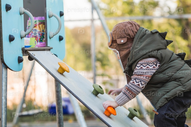 Детство. Маленький мальчик играет на детской площадке. Альпинист взбирается на гору. Красивый портрет ребенка, играющего на улице