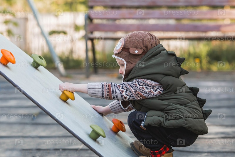 Детство. Маленький мальчик играет на детской площадке. Альпинист взбирается на гору. Красивый портрет ребенка, играющего на улице