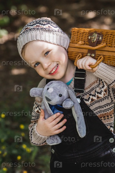Детство. Маленький мальчик на улице с чемоданом и плюшевым кроликом отправляется в путешествие. Красивый портрет ребенка, играющего на улице