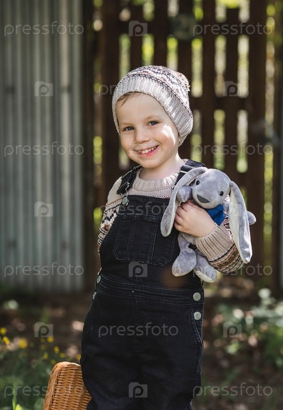 Детство. Маленький мальчик на улице с чемоданом и плюшевым кроликом отправляется в путешествие. Красивый портрет ребенка, играющего на улице