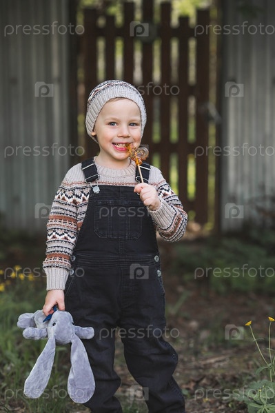 Детство. Маленький мальчик на улице с плюшевым кроликом и леденцом. Красивый портрет ребенка, играющего на улице