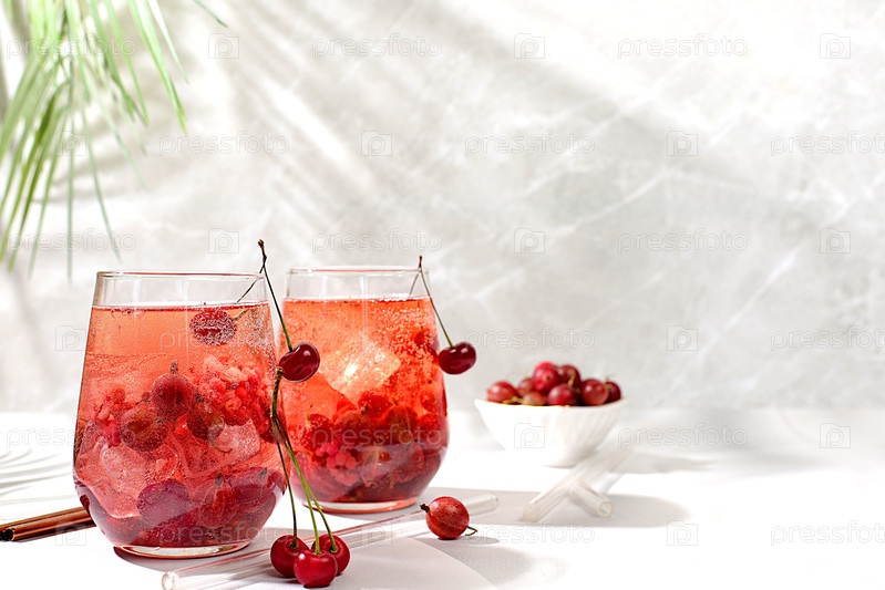 Освежающий летний домашний лимонадный коктейль, мохито с вишней, крыжовником, мятой и лимоном, концепция снижения веса, детокс-вода с фруктовым вкусом на светлом фоне. здоровая и натуральная пища