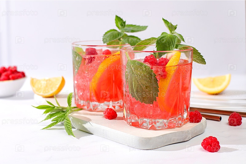 Холодный домашний лимонадный коктейль, мохито с мятой, малиной и фруктами на солнечном столе, рецепт освежающего летнего напитка, концепция детокс-диеты и снижения веса, меню ресторана