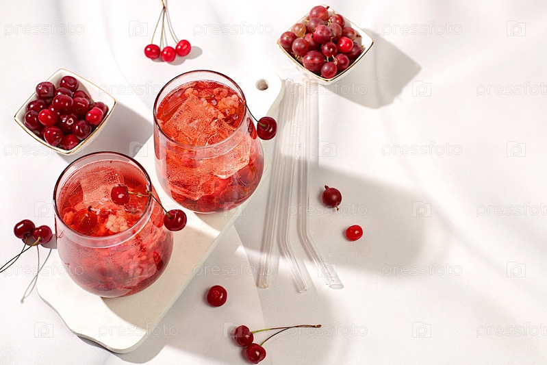 Холодный домашний лимонадный коктейль, мохито с мятой, вишней и крыжовником на солнечном столе, рецепт освежающего летнего напитка, концепция детокс-диеты и снижения веса, меню ресторана, избирательный подход