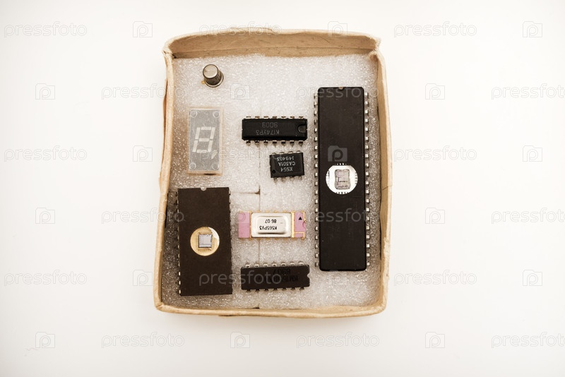 Несколько микросхем на белой пене. Старые интегральные схемы для радиоэлектроники