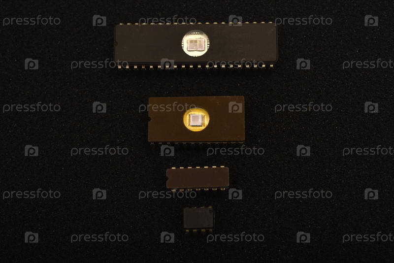 Несколько микросхем на черном поролоне. Старые интегральные схемы для радиоэлектроники