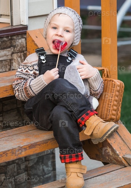 Детство. Маленький мальчик в стильной одежде сидит на деревянном крыльце с леденцом и мягкой игрушкой возле дома на свежем воздухе. Счастливое детство
