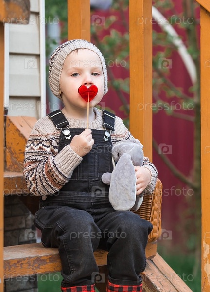 Детство. Маленький мальчик в стильной одежде сидит на деревянном крыльце с леденцом и мягкой игрушкой возле дома на свежем воздухе. Счастливое детство