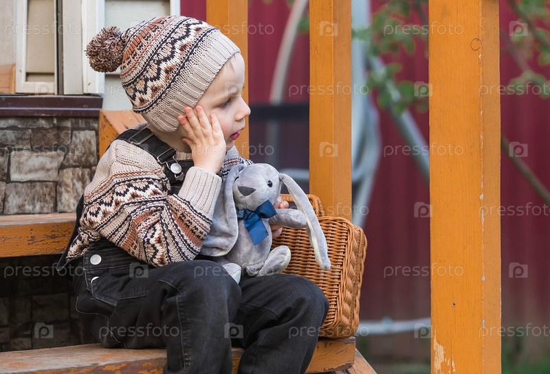 Детство. Маленький мальчик в стильной одежде сидит на деревянном крыльце с мягкой игрушкой возле дома на свежем воздухе. Счастливое детство