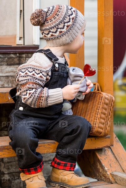 Детство. Маленький мальчик в стильной одежде сидит на деревянном крыльце с леденцом и мягкой игрушкой возле дома на свежем воздухе. Счастливое детство