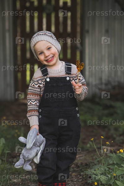 Детство. Маленький мальчик на улице с плюшевым кроликом и леденцом. Красивый портрет ребенка, играющего на улице