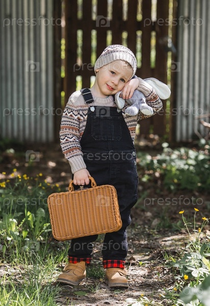 Детство. Маленький мальчик на улице с чемоданом и плюшевым кроликом отправляется в путешествие. Красивый портрет ребенка, играющего на улице