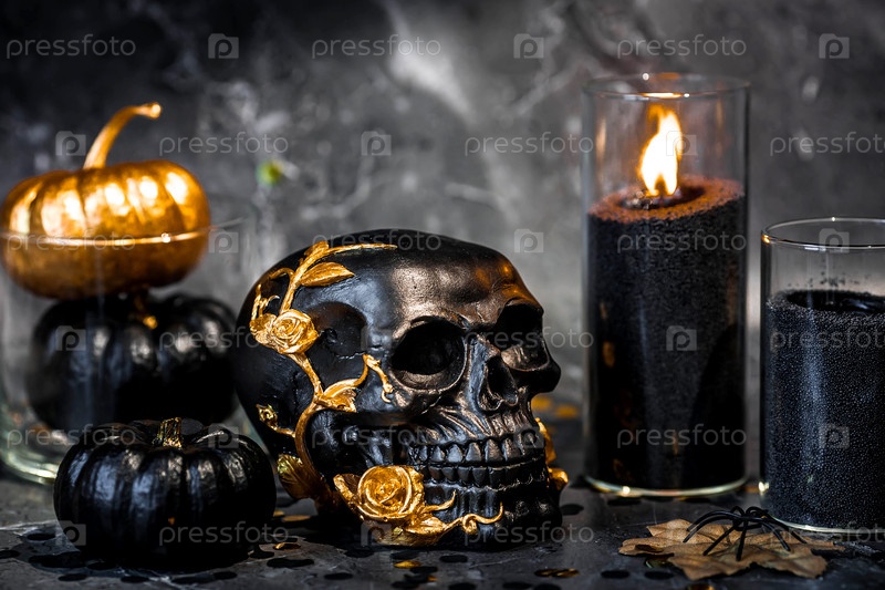 Таинственный черный череп с золотыми розами и тыквами для вечеринки в честь Хэллоуина или Дня мертвых на черном гранжевом фоне