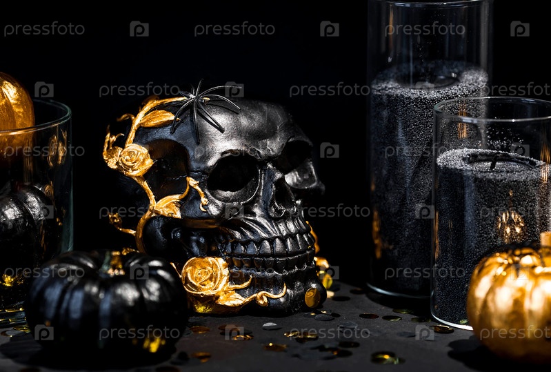 Таинственный черный череп с золотыми розами и тыквами для вечеринки в честь Хэллоуина или Дня мертвых на черном гранжевом фоне