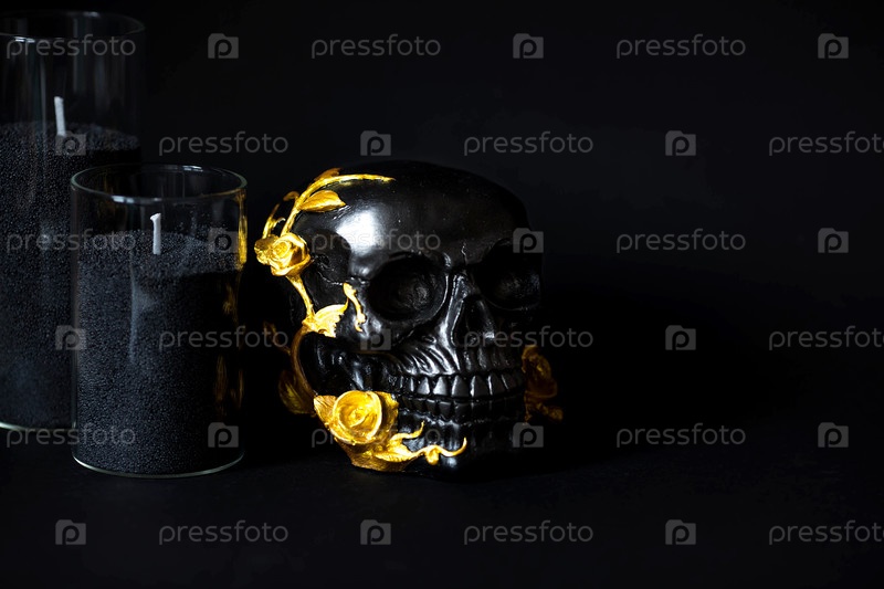 Таинственный черный череп с золотыми розами и тыквами для вечеринки в честь Хэллоуина или Дня мертвых на черном гранжевом фоне
