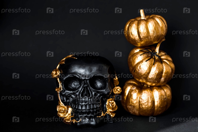 Таинственный черный череп с золотыми розами и тыквами для вечеринки в честь Хэллоуина или Дня мертвых на черном гранжевом фоне