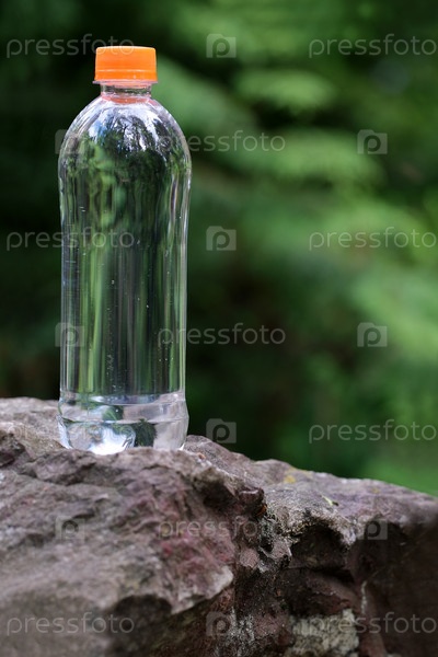 Бутылка для воды на фоне зеленого леса. Дизайн упаковки