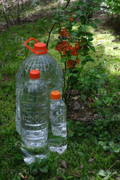 Три бутылки с водой на фоне зеленого леса. Дизайн упаковки